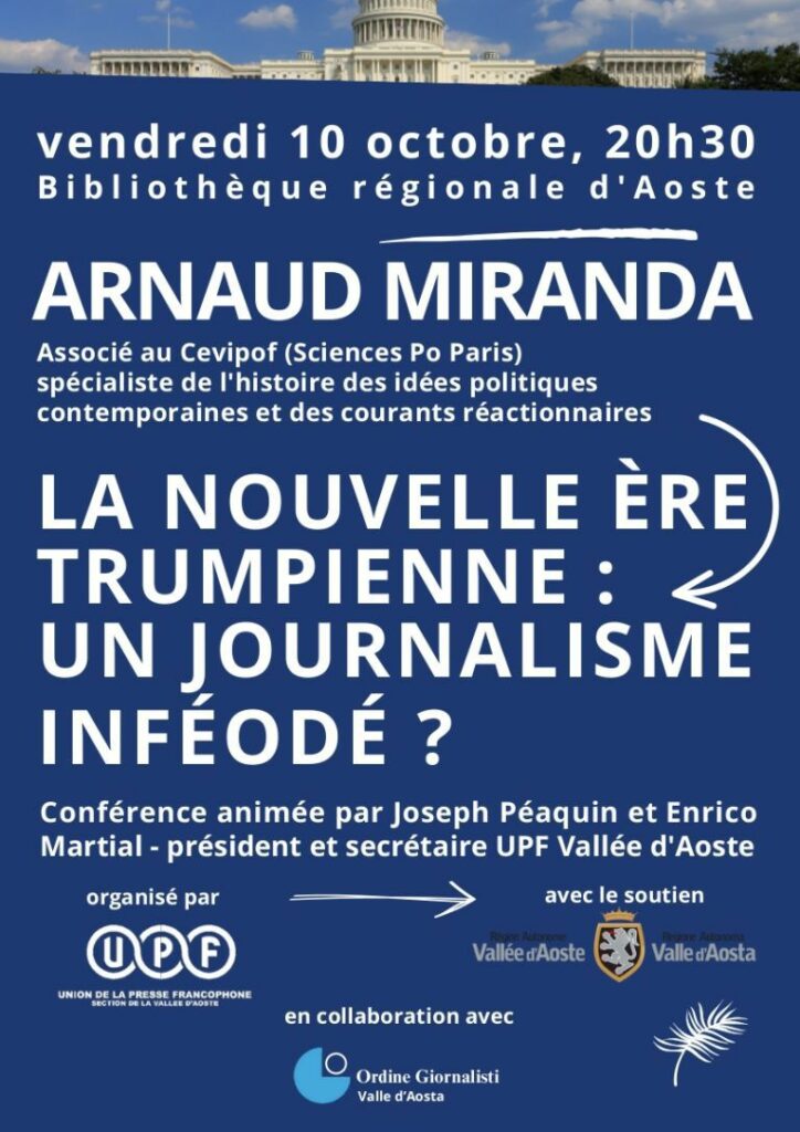 Venerdì 10 ottobre 2025, la Biblioteca Regionale di Aosta ospiterà una conferenza dal titolo “La nouvelle ère Trumpienne : un journalisme inféodé ?”, a partire dalle 20.30, con ingresso libero e gratuito. L’evento, organizzato dall’Union de la Presse Francophone – Section de la Vallée d’Aoste, con il contributo del Servizio Attività Culturali della Regione e in collaborazione con l’Ordine dei Giornalisti della Valle d’Aosta, sarà moderato dal Presidente Joseph Péaquin e dal Segretario Enrico Martial, e assegnerà crediti per la formazione continua.