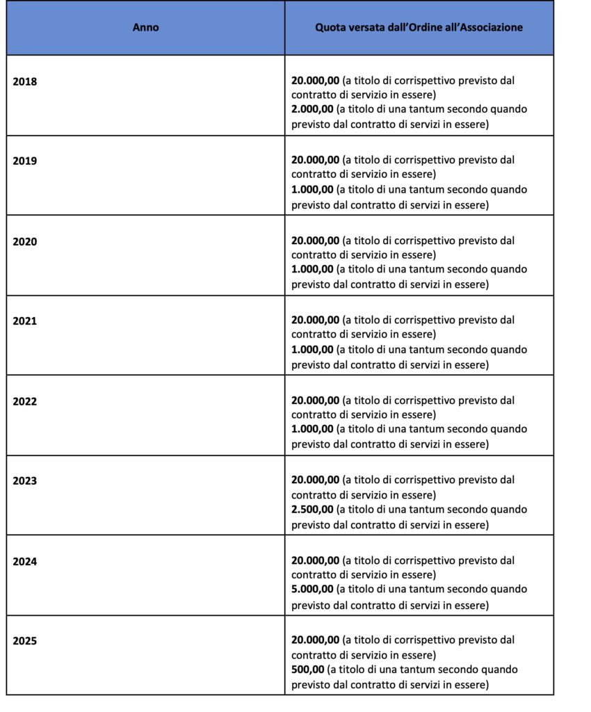 Di seguito il dettaglio delle somme versate all’Associazione nel corso degli ultimi esercizi: